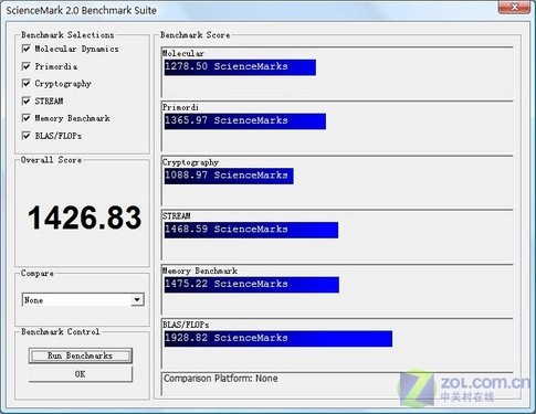 PCMark Vantage Pro測試結(jié)果(點(diǎn)擊放大) 通過結(jié)果可以看出除了“TV and Movie”得分不高外,其余測試均得到了很高的分?jǐn)?shù),整體性能很平衡。再來看一下ScienceMark的整機(jī)測試結(jié)果: