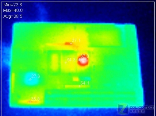背面只有在內(nèi)存部分較熱,最高在40攝氏度左右,比較符合實(shí)際應(yīng)用的情況。從熱象圖可以看出8730w工作站在散熱設(shè)計(jì)上確實(shí)下足了功夫,雖然采用了不少發(fā)熱量較大的部件,但是將溫度控制在了一個(gè)可以接受的溫度。