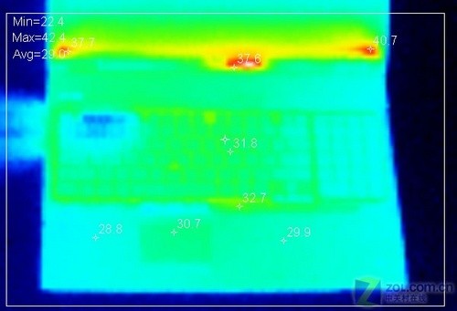測試結(jié)果 SPECapc for SolidWorks 2007測試中,惠普8730w工作站I/O得分1.99,CPU得分2.66,顯卡得分2.48,總分2.49。 通過上面的專業(yè)測試以及和參考系統(tǒng)的比較結(jié)果可以看出,惠普8730w移動(dòng)工作站在專業(yè)應(yīng)用方面表現(xiàn)出了強(qiáng)大的性能,并沒有因?yàn)橥庑蔚南拗贫鵂奚阅堋?nbsp; 7、熱量測試 熱量測試采用專業(yè)的FLUKE Ti20 熱像儀,并且在進(jìn)行SPEC測試之后進(jìn)行熱量測試,比較符合真實(shí)的應(yīng)用情況,室溫22攝氏度左右。從熱象圖可以看到在經(jīng)過高負(fù)荷運(yùn)行后,惠普8730w最高溫度在42設(shè)置度左右,鍵盤、掌托等接觸部分溫度并不高,不會(huì)讓人產(chǎn)生不適。