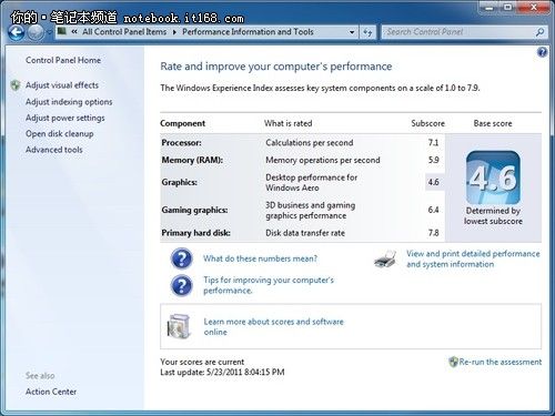 從Windows7系統(tǒng)評(píng)估來看,整體最終得分為4.6,除了桌面圖形性能表現(xiàn)略低之前,其他子項(xiàng)均達(dá)到5.9分以上的評(píng)價(jià),特別是硬盤性能的表現(xiàn)十分突出。