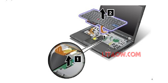 然后就可以看到這臺二手T420鍵盤下面的內(nèi)存位置了,一般來說內(nèi)存上面有個小的塑料片防止灰塵等,和后面的拆卸一樣按照下圖中操作就可以了