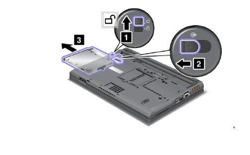 下圖中我們首先將筆記本的電池和電源都拔掉(其實筆者很少這樣做,如果要換的話關(guān)機(jī)都沒有關(guān)就直接開始操作了,但是聯(lián)想在技術(shù)手冊上強(qiáng)烈建議大家關(guān)閉計算機(jī)的電源拔掉電池再操作) 下圖中有分別幾個阿拉伯?dāng)?shù)字教你第一步先打卡鎖,然后第二部就是推出光驅(qū)就可以了,第三部不用說了用手拿著出來的光驅(qū)。
