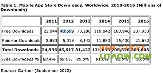 日前高德納咨詢公司發(fā)布了2012移動應(yīng)用下載報告,在今年各應(yīng)用下載量高大家456億次,雖然其中大部分為免費應(yīng)用,但是這個總量也夠讓人吃驚的。如下圖所示,可以從數(shù)據(jù)看出,其中百分之九十為免費下載應(yīng)用程序,各種分類上蘋果應(yīng)用占了總下載量的四分之一,也就是百分之二十五是從蘋果的IOS APP商店下的。當然明天凌晨也將就是新一代蘋果的發(fā)布日了,這會不會更促進蘋果熱和下載量的趨勢呢。當然這并不是應(yīng)用下載量在今年暴漲的重要原因,這些下載量分別來自于蘋果,谷歌以及微軟的應(yīng)用程序商店平臺。據(jù)高德納估計,在2016全球移動應(yīng)用下載量將會到達3000億次,其中百分之九十三將來自于免費的應(yīng)用程序的趨勢將不會有改變,反而會更多的來自于免費版。