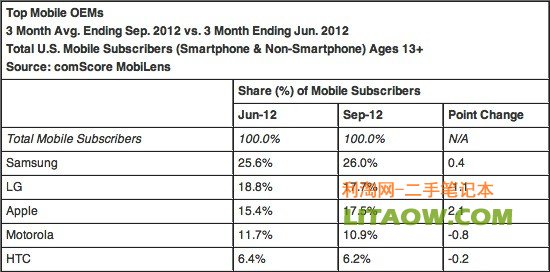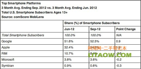全球性互聯(lián)網(wǎng)信息服務(wù)提供商ComScore發(fā)布最新全球手機系統(tǒng)平臺占有率,其中上升幅度最大的是蘋果的iOS系統(tǒng)。ComScore是在最近一個季度間遍訪了美國超過3萬名智能手機使用的用戶,以此來為基準(zhǔn)分析得出現(xiàn)在全球市場手機的市占有率,其中在智能手機平臺占有率方面,谷歌依然勞勞的把持住手機系統(tǒng)市場上的龍頭老大位置,市占有率高達百分之五十二點五,超過一半的占有率,但上升幅度最大的還算是蘋果的IOS系統(tǒng),上升了百分之二左右,以百分之三十四點三的市場占有率位居第二位,其它依次是黑莓系統(tǒng),微軟的windows系統(tǒng)還諾基亞的塞班系統(tǒng)。其中降幅最多的是黑莓系統(tǒng)。看來谷歌和蘋果已經(jīng)不是其它系統(tǒng)能陰檔的了的了。