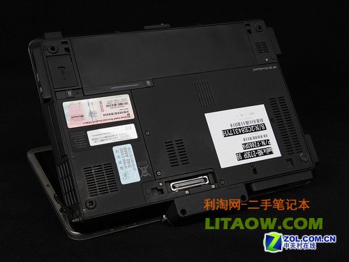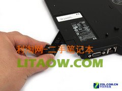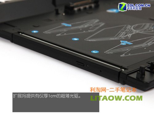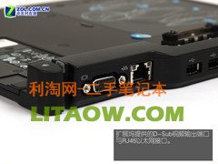 該擴展塢將接口放置在了其后側(cè),而一個僅厚1cm的超薄光驅(qū)則被一同放置在了擴展塢中。從擴展塢后方,我們可以看到其提供了1個D-Sub視頻輸出接口(原機D-Sub接口會因擴展塢的接駁而被擋?。┡cRJ45以太網(wǎng)接口。
