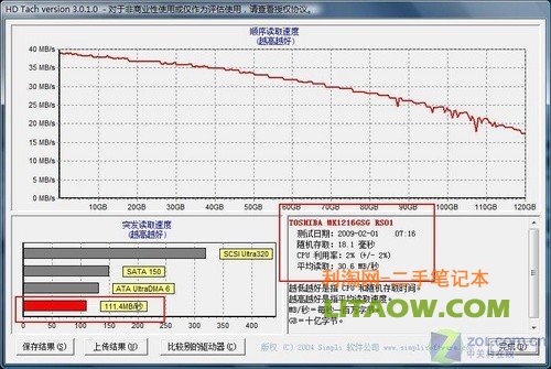 根據(jù)HD Tach軟件測試結(jié)果看,111.4MB/秒的突發(fā)傳輸率與30.6MB/秒的持續(xù)傳輸率只能相當(dāng)于上一代2.5英寸SerialATA硬盤。但是極平緩的順序讀取曲線卻表明了這塊硬盤能夠在任何時候都表現(xiàn)出均衡的讀寫性能,而這也是保證日常使用的關(guān)鍵。