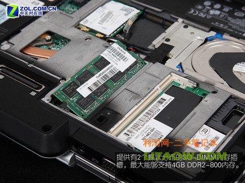 通過拆解可以發(fā)現(xiàn),2730p具備有2個SO-DIMM內(nèi)存插槽,其最大能夠支持4GB-DDR2 800內(nèi)存。內(nèi)存排布以蝶狀形式分布,這不但降低了整機的厚度也更進一步解決了內(nèi)存運行時相互之間的電磁干擾。