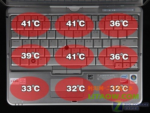 曾經(jīng)在測試蘋果MacBook時金屬模具在整機高負荷運行后表現(xiàn)出來的熱量仍舊讓我難忘。那么同為金屬外殼的HP EliteBook 2730p將會有怎樣的表現(xiàn)呢?我將2730p在27℃的情況下運行PCMark 05一個小時后使用紅外線點式測溫儀對其各部分的溫度進行測試。