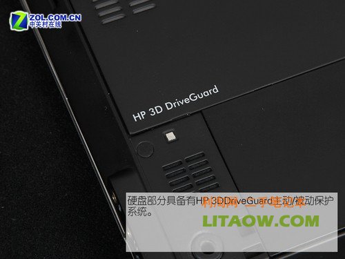 看到機體底部“HP 3D DriveGuard”的標(biāo)識了嗎?這代表2730p具備有主動、被動兩種硬盤抗震模式。所謂被動抗震即是在硬盤周圍的那圈藍色減震橡膠,而主動抗震則是內(nèi)置于筆記本中的重力感應(yīng)芯片,用戶可以通過“HP 3D DriveGuard System”來進行相應(yīng)的設(shè)置。
