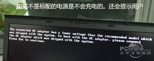與此同時(shí),當(dāng)90W的ThinkPad適配器與W530連接后,開機(jī)時(shí)會(huì)發(fā)現(xiàn)屏幕上會(huì)提示該適配器最大功率低于要求功率的字樣,而即使進(jìn)入系統(tǒng)也會(huì)顯示沒有接入電源適配器,當(dāng)然,機(jī)器本身的最大性能也不能徹底發(fā)揮。