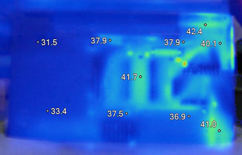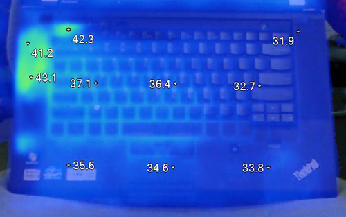 以上兩張圖片是在32攝氏度環(huán)境下運(yùn)行FurMark拷機(jī)軟件一小時(shí)的熱輻射圖,對于一款配備45W四核處理器與55W度顯卡的機(jī)器來說,這樣的表現(xiàn)值得稱道,ThinkPad的精髓也在W530身上體現(xiàn)的淋漓盡致。