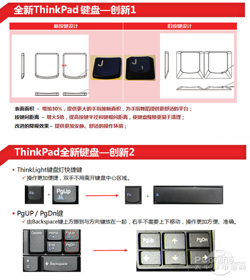 除了單個(gè)按鍵的設(shè)計(jì)外,整個(gè)鍵盤的格局也同樣是重中之重,拿X220上的鍵盤舉幾個(gè)簡單的例子:F1-F12分為3組,每4個(gè)單個(gè)按鍵一組,用戶只需用手指感觸,就能夠做到對幾個(gè)常用的Fx鍵做出準(zhǔn)確定位;Home/End、pgUp/pgDn被設(shè)計(jì)在鍵盤的右上側(cè),查看PDF等文件時(shí),用戶幾乎不用刻意去找;右下角的方向鍵為凸出設(shè)計(jì)且面積合理,在操作過程中舒服且不會(huì)有任何局促感。