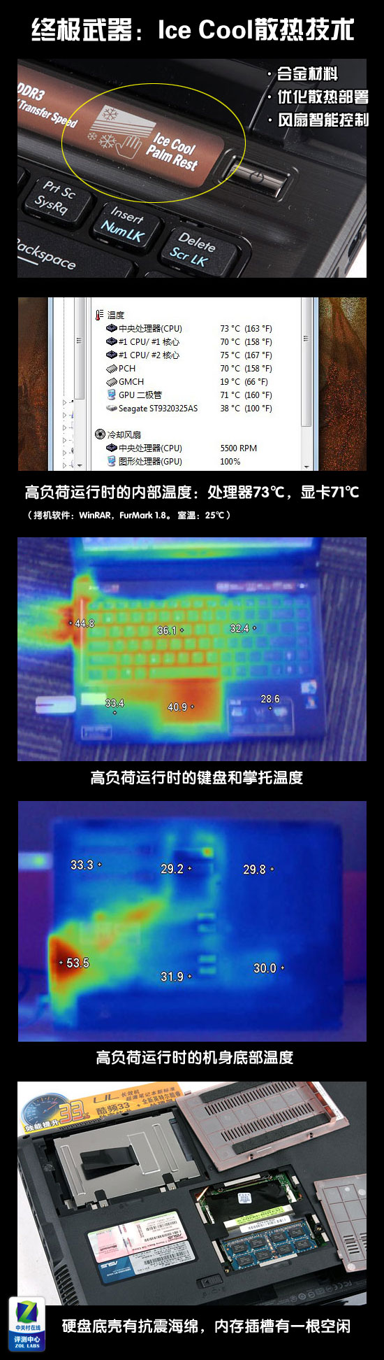 一款筆記本,無論性能有多好、續(xù)航時間有多長,如果散熱效果不好也是無法令人滿意的。在華碩UL80Jt的機身貼標中,我們看到“Ice Cool Palm Rest”(清涼掌托)的字樣,看來它對自己的散熱效果還是有信心的。下面我們就通過實際測試,來看看它的內(nèi)部和表面溫度究竟如何?