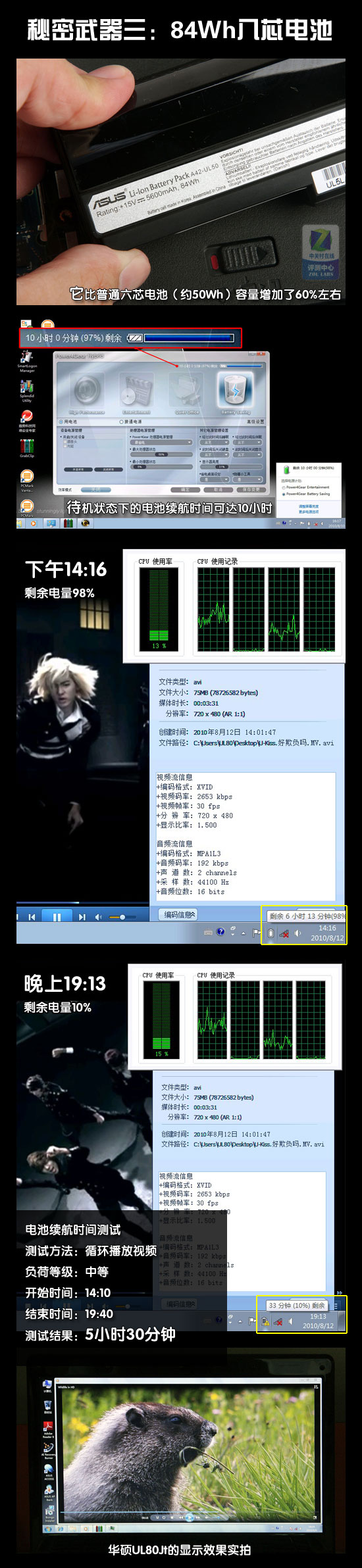 那么,當超省電的處理器和顯卡配上大容量電池后,UL80Jt可以持續(xù)工作多長時間呢?在下面的截圖中,我們看到這款本本在低負荷的待機狀態(tài)下可以續(xù)航10小時左右,但很明顯這個數(shù)據(jù)并沒有太大意義,我們想知道的是筆記本在不間斷的正常使用下,實際能工作多少小時?