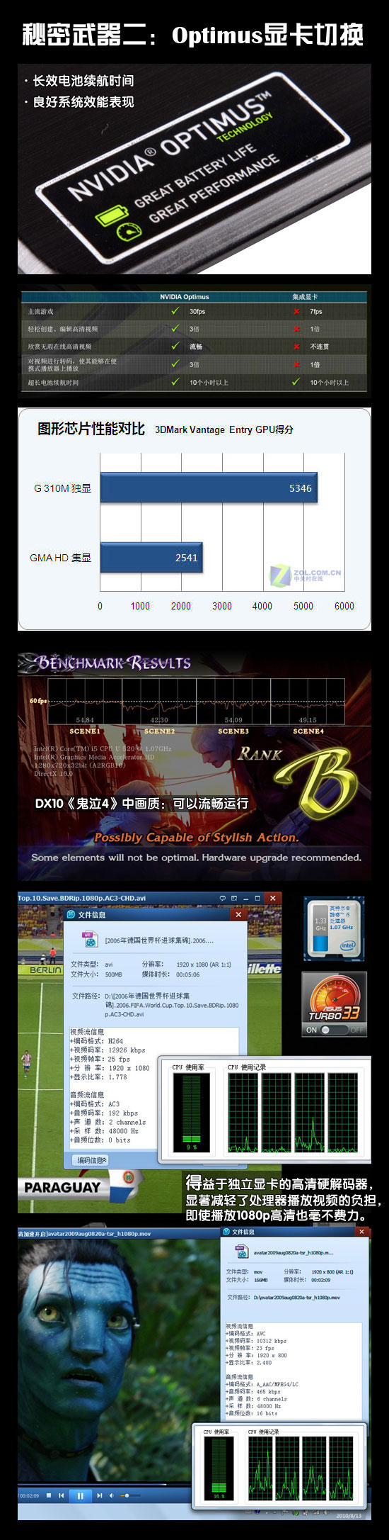 從上面的測試成績來看,G 310M獨顯的性能大約是集顯的兩倍左右,玩普通游戲、看高清電影都沒有任何問題。如果說Turbo33解決了CPU方面的性能瓶頸,那么Optimus就解決了顯卡方面的性能瓶頸,同時在電池續(xù)航時間方面也沒有任何妥協(xié)。